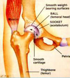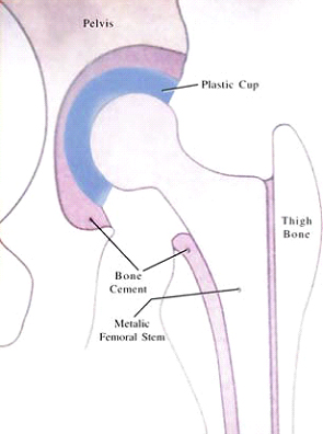 Hip is a ball and socket joint. The ball is removed and replaced with a metal ball fixed to the thighbone. The socket is cleaned & fitted with a plastic cup with or without bone cement.