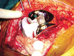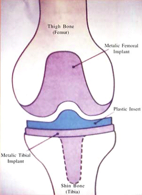 The damaged surface of knee bones are removed & replaced with metal surface & fixed to bone with bone cement & plastic inserted in between. The surface of kneecap is also replaced with plastic button.